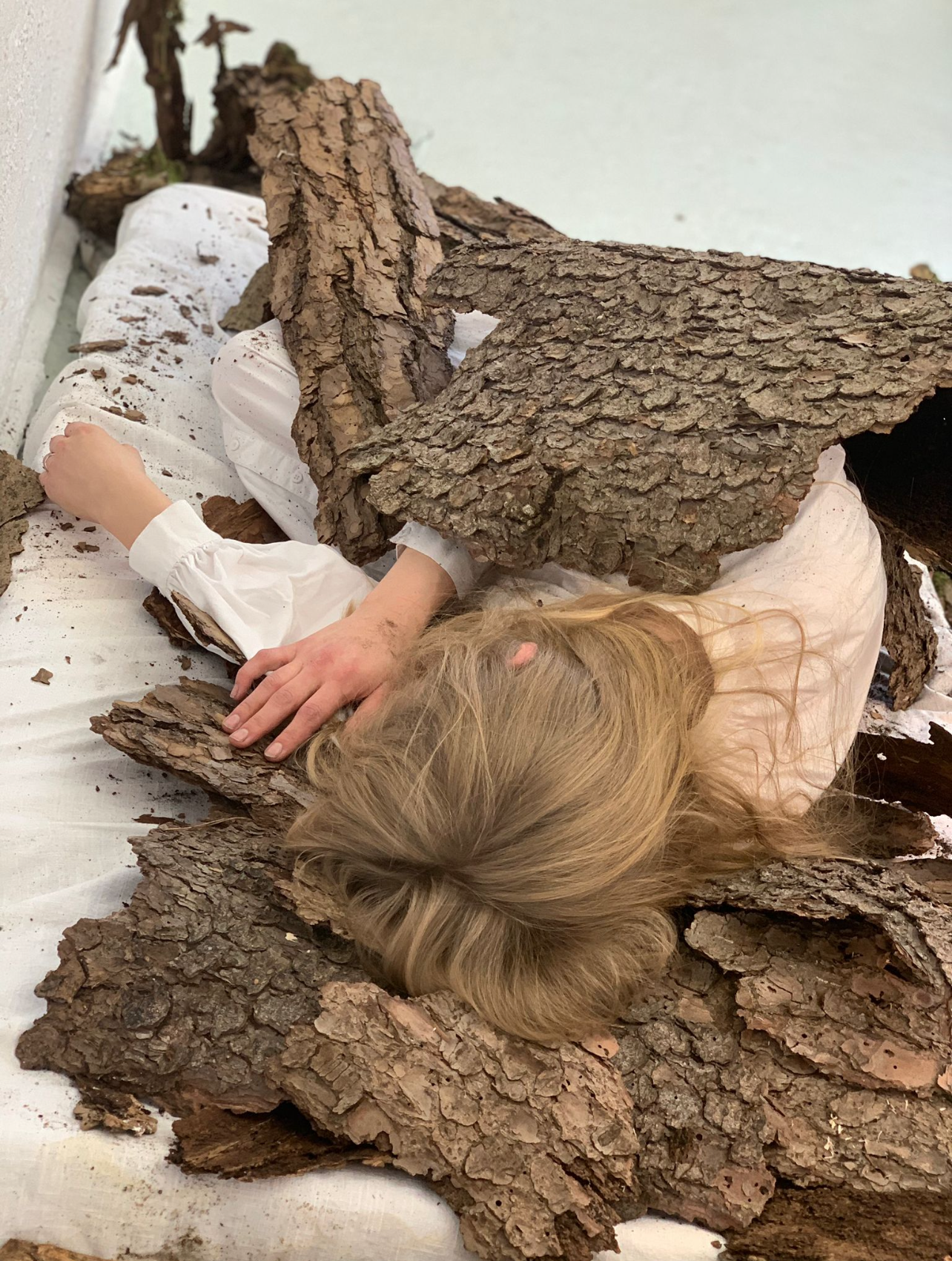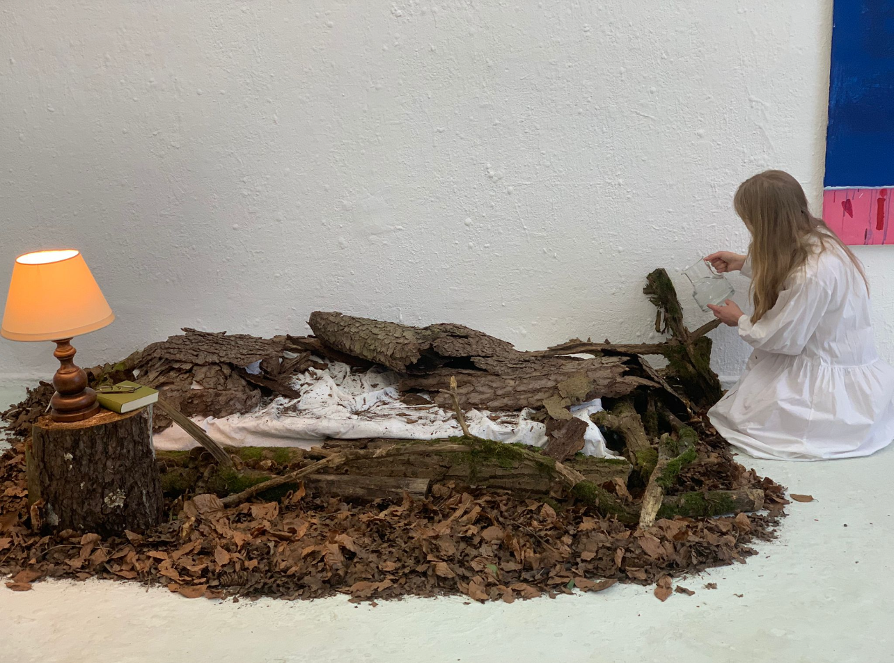The forest, which for me is a place of silence, safety, and returning to oneself, has become a fixed part of my home. With the bed surrounded by tree trunks, the tree bark acting as fabric, bedding me and enclosing me, I too become part of the forest. During the exhibition walk in which this work was shown, I included myself in the piece and performed a kind of ritual in which I watered the moss-covered tree trunks so that the moss would not dry out. Afterwards, I lay down in the bed and rested.