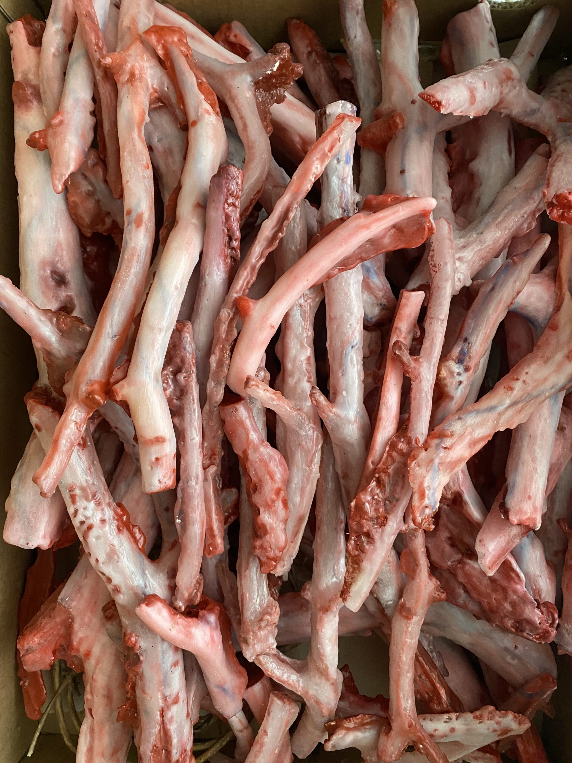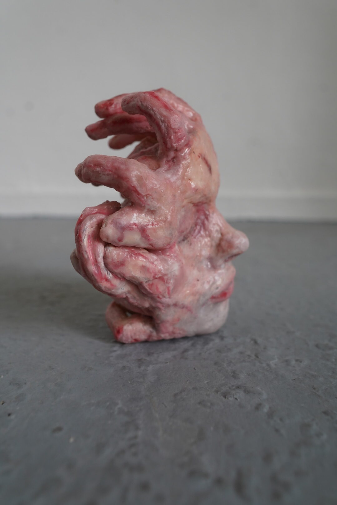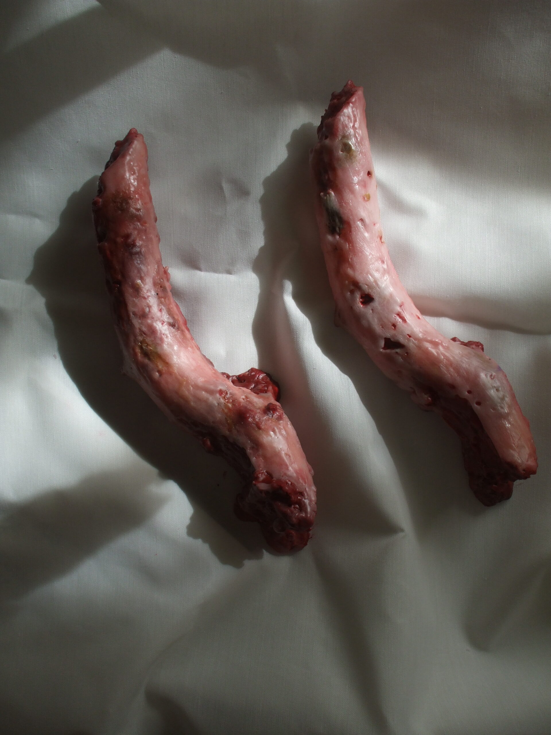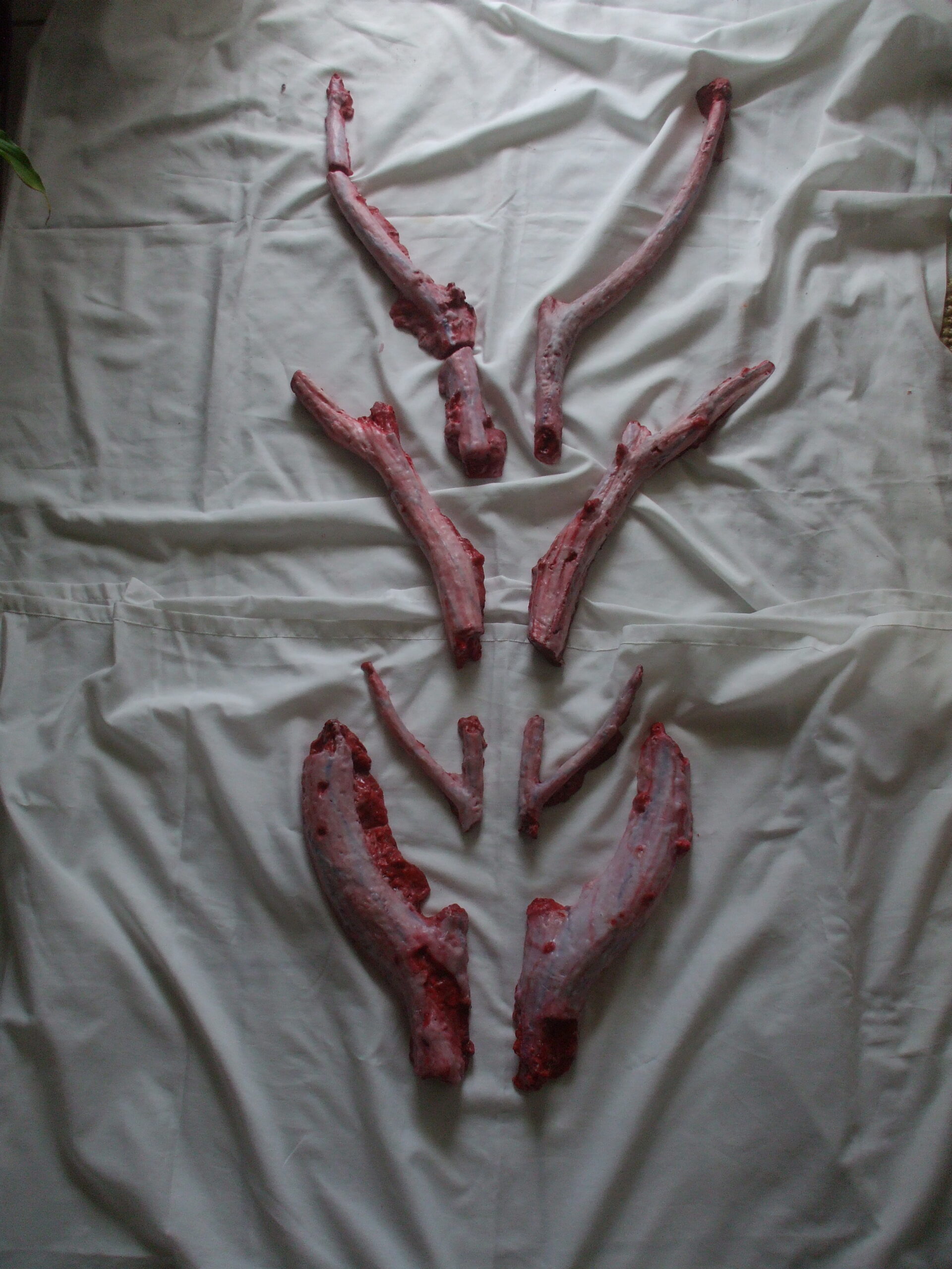 In 2024, I first started working with materials such as wax. I came across the idea of building, or casting antlers, using wax as the base material, then coloring it with oil paint. I used sticks that I found in the forest near my home for the form by dipping them into alginate, then removing the stick or branch and fill in the form with wax. The result looked quite a lot like bones, which I liked and what became the idea of my graduation work in 2025.